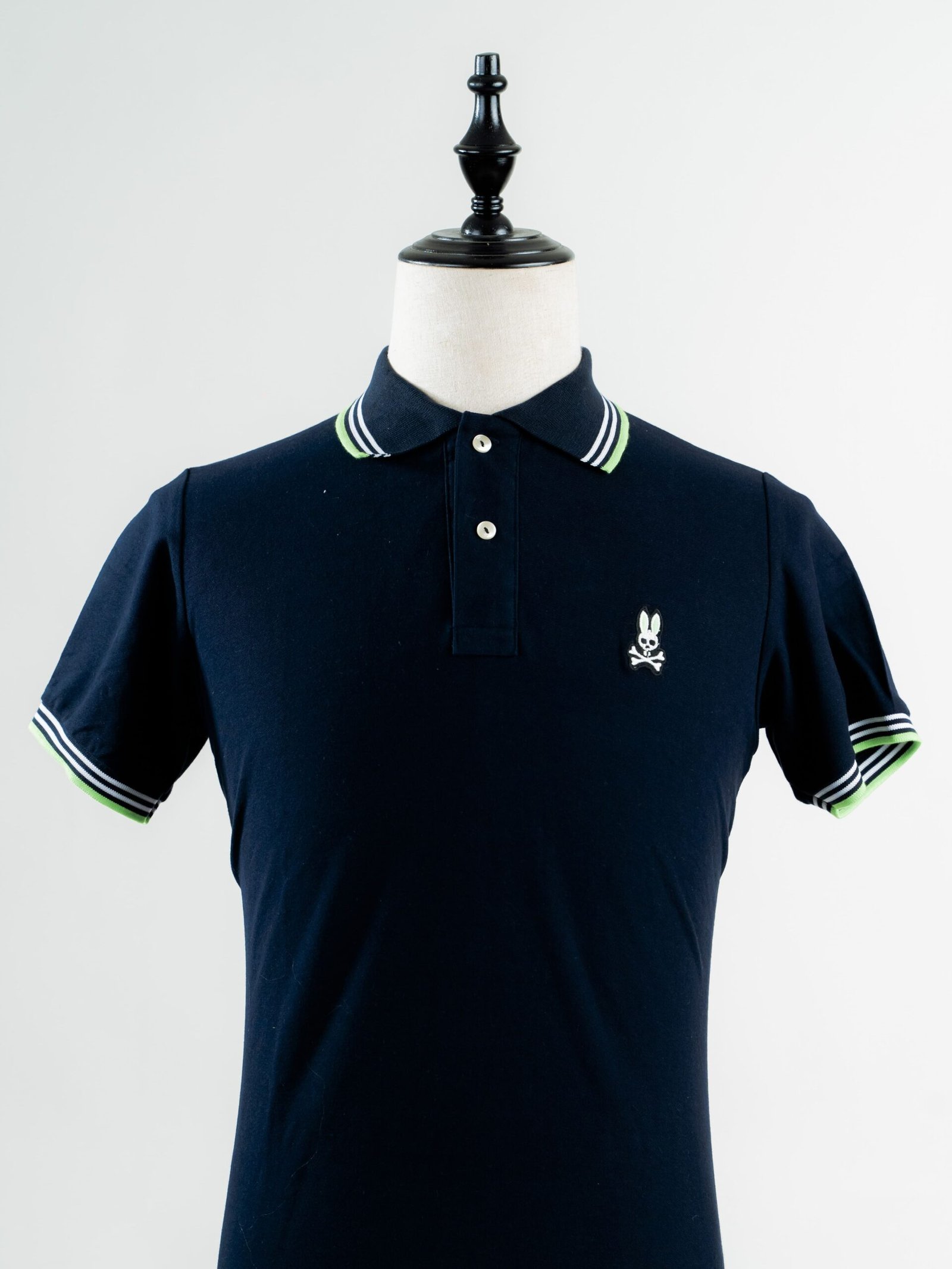 Camisa regular con cuello, lisa, 100% algodón para caballero. Colores azul marino cuello verde con blanco. Tipo regular. Con cuello. Psycho Bunny.