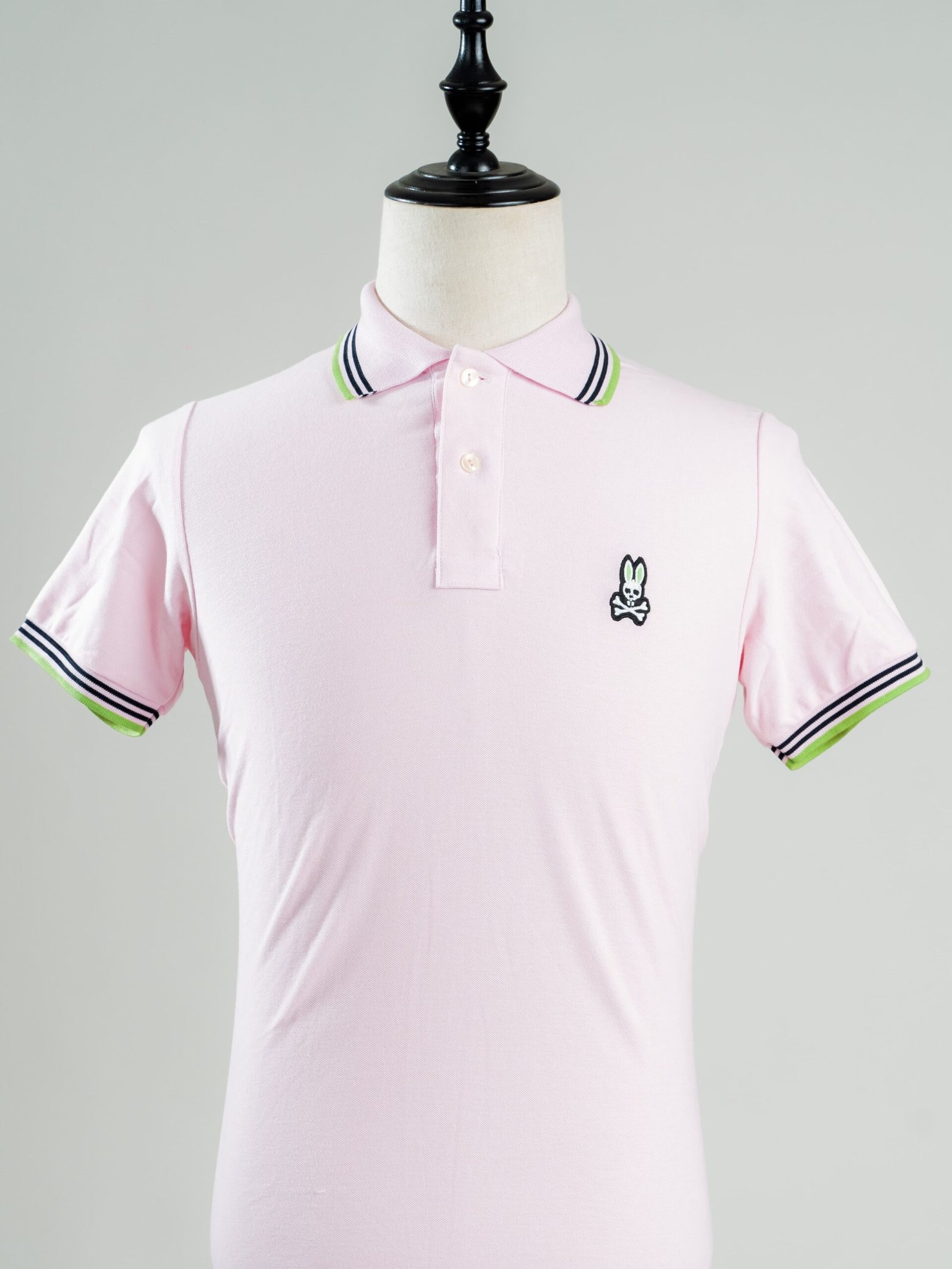 Camisa regular con cuello, lisa, 100% algodón para caballero. Colores Rosado cuello verde con negro. Tipo regular. Con cuello. Psycho Bunny.