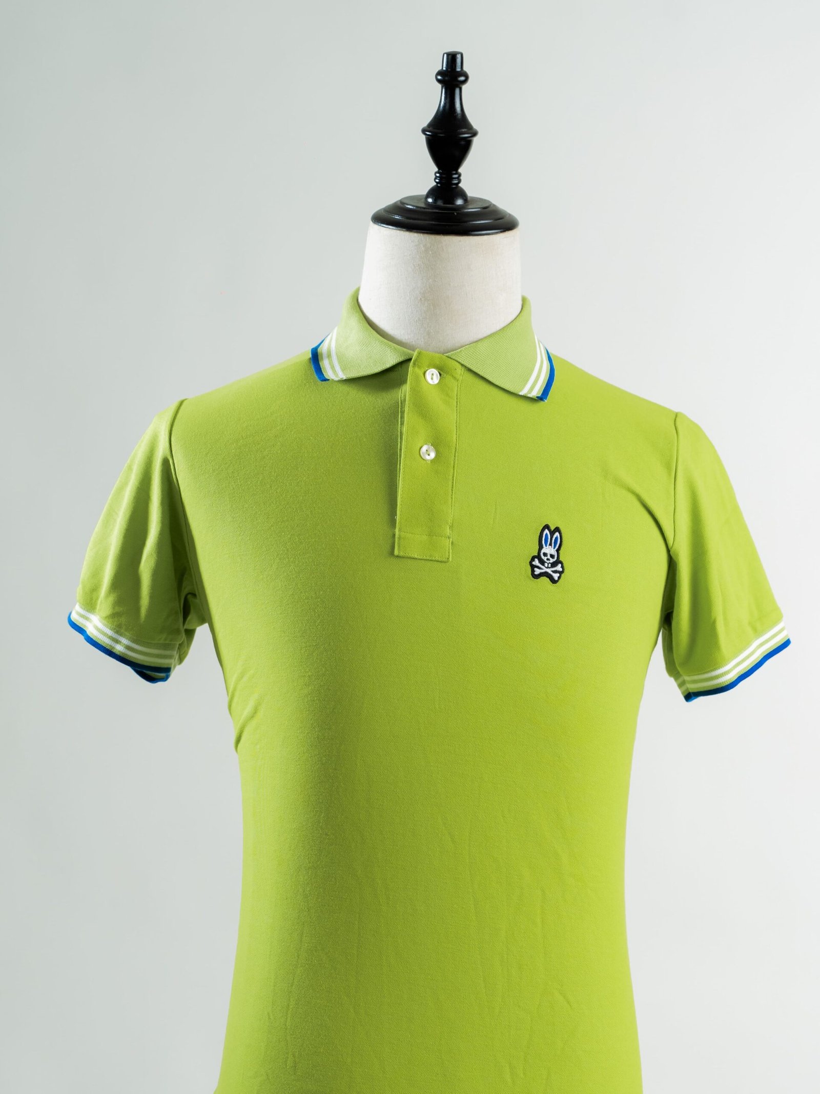 Camisa regular con cuello, lisa, 100% algodón para caballero. Colores verde con cuello azul con blanco. Tipo regular. Con cuello. Psycho Bunny.